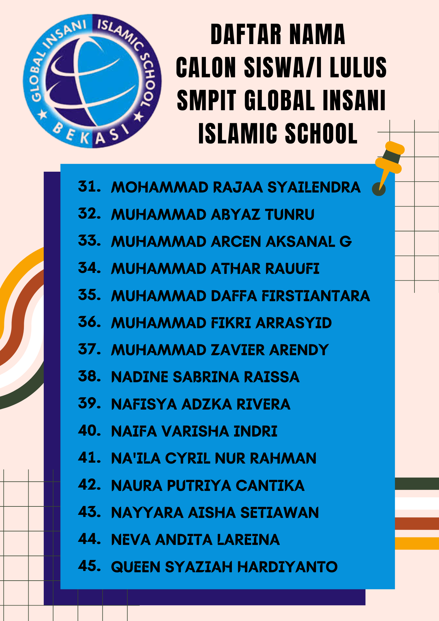Ayah/Bunda calon siswa/i SMPIT Global Insani, Berdasarkan hasil test tanggal 03 Februari 2024, berikut kami lampirkan nama-nama calon siswa/i yang LULUS masuk SMPIT Global Insani.