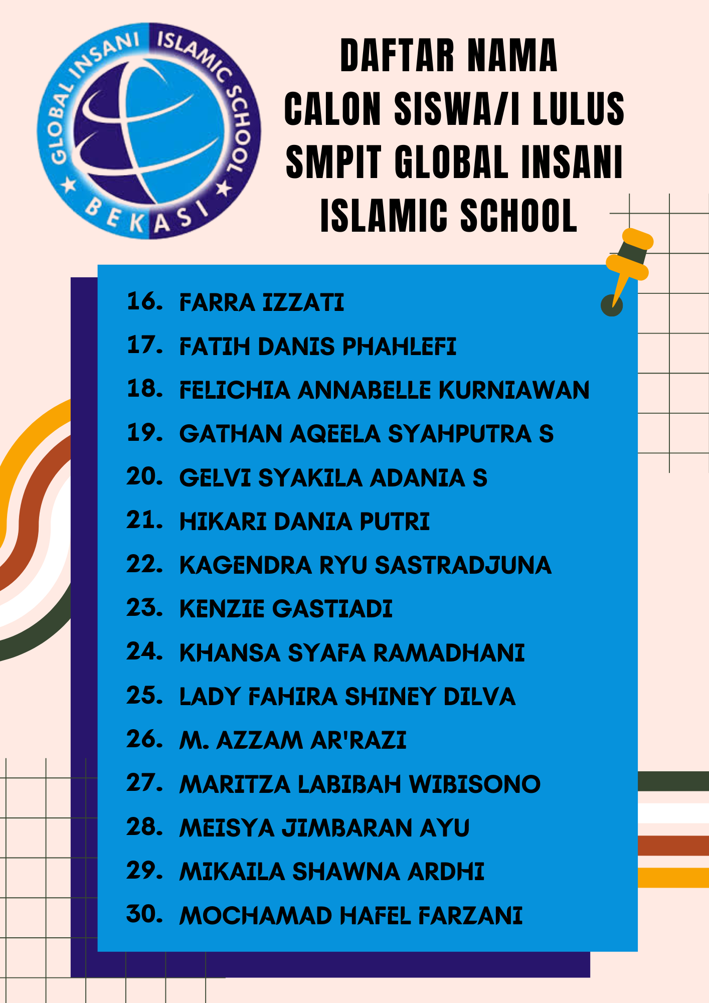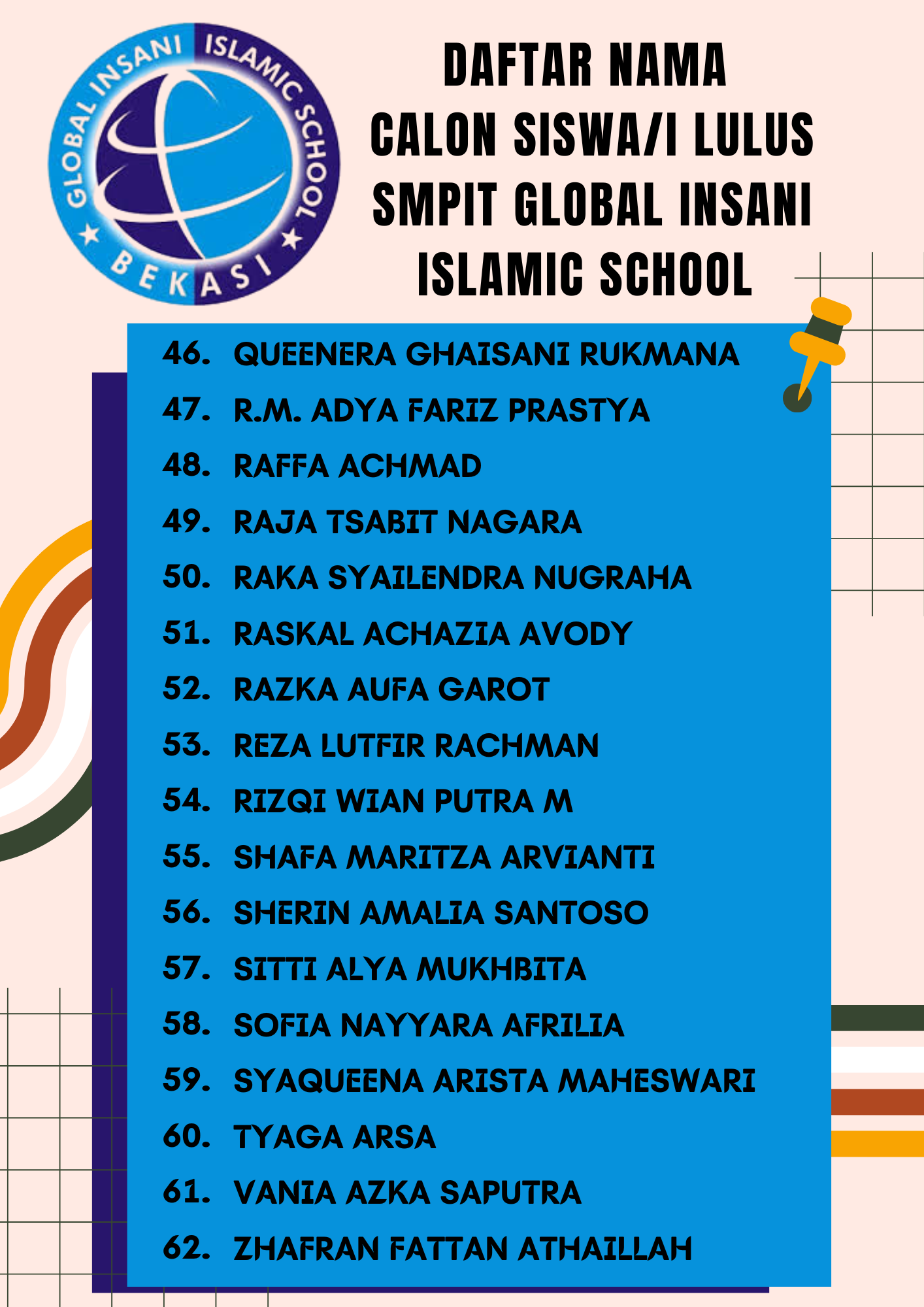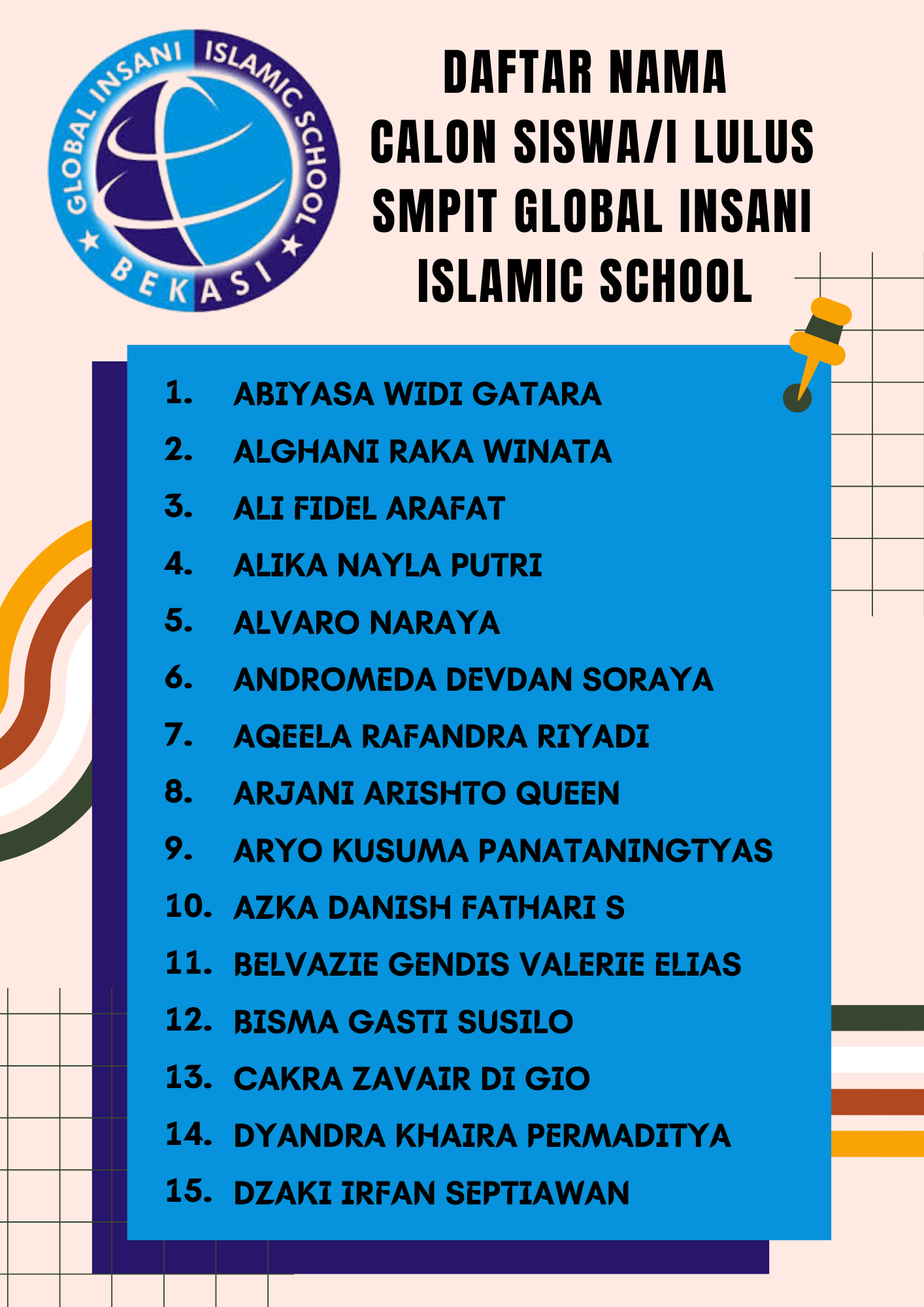Ayah/Bunda calon siswa/i SMPIT Global Insani, Berdasarkan hasil test tanggal 03 Februari 2024, berikut kami lampirkan nama-nama calon siswa/i yang LULUS masuk SMPIT Global Insani.